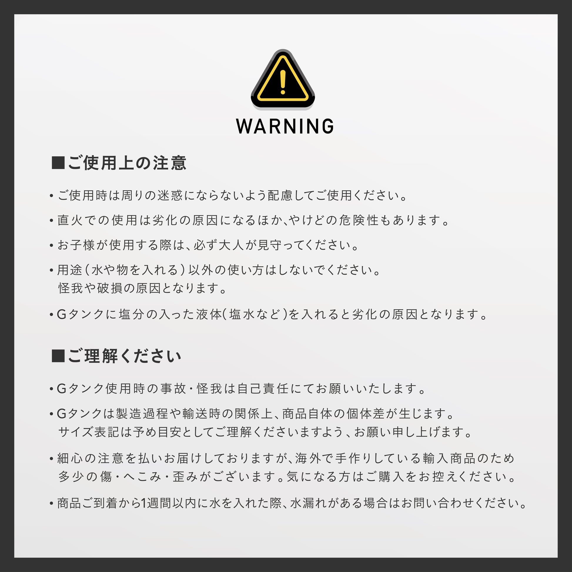 Gタンクは亜鉛メッキ鋼板によるサビ対策を施しておりますが、使用環境や傷などにより黒サビ、白サビが発生する場合がございます。