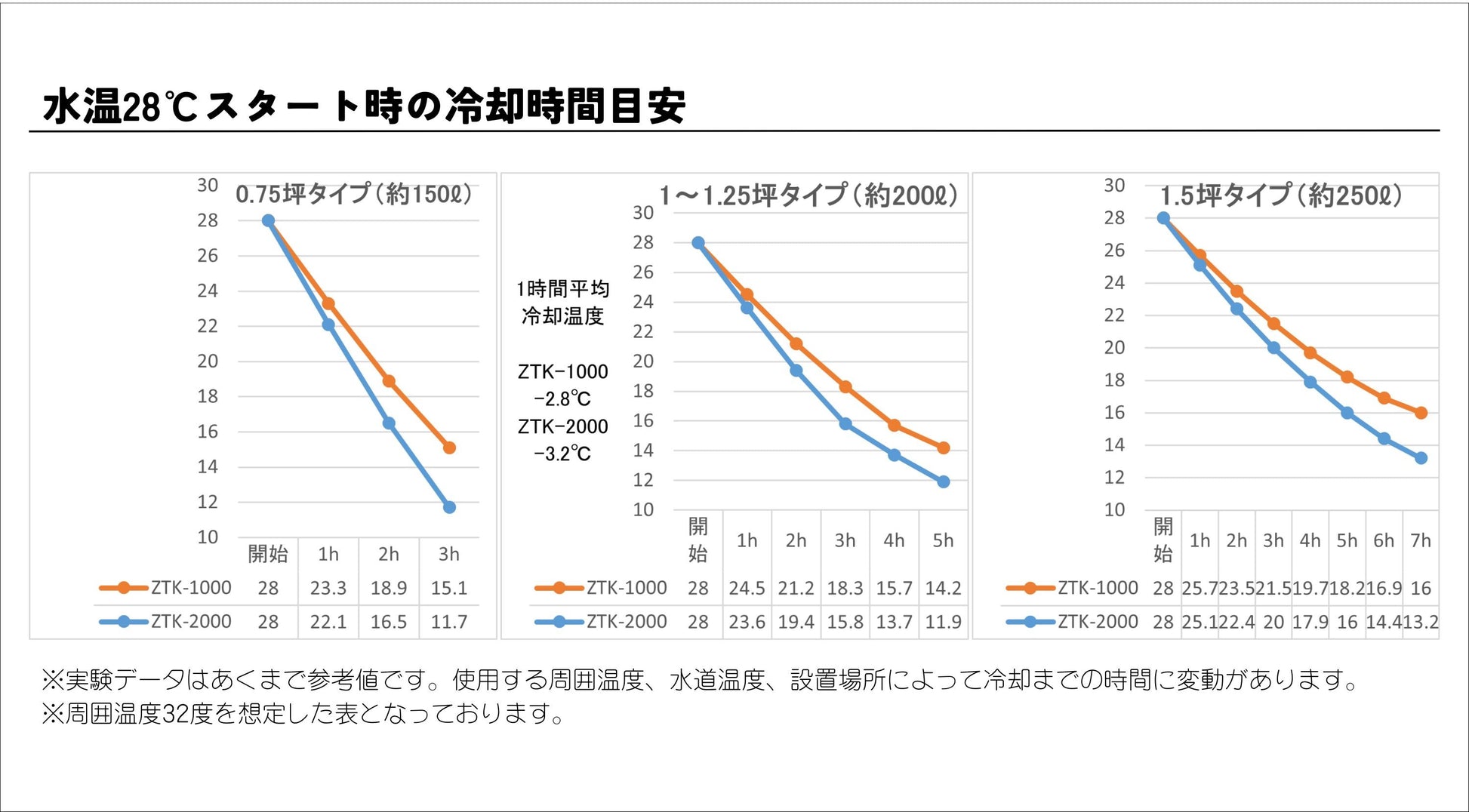 ・Gタンクでご使用の場合、水量が250Lを超えると冷却時間は目安よりも長くなります。水位を調整するなどしてご使用ください。(参考: ラウンドⅡ Sサイズ 8割で約300L)